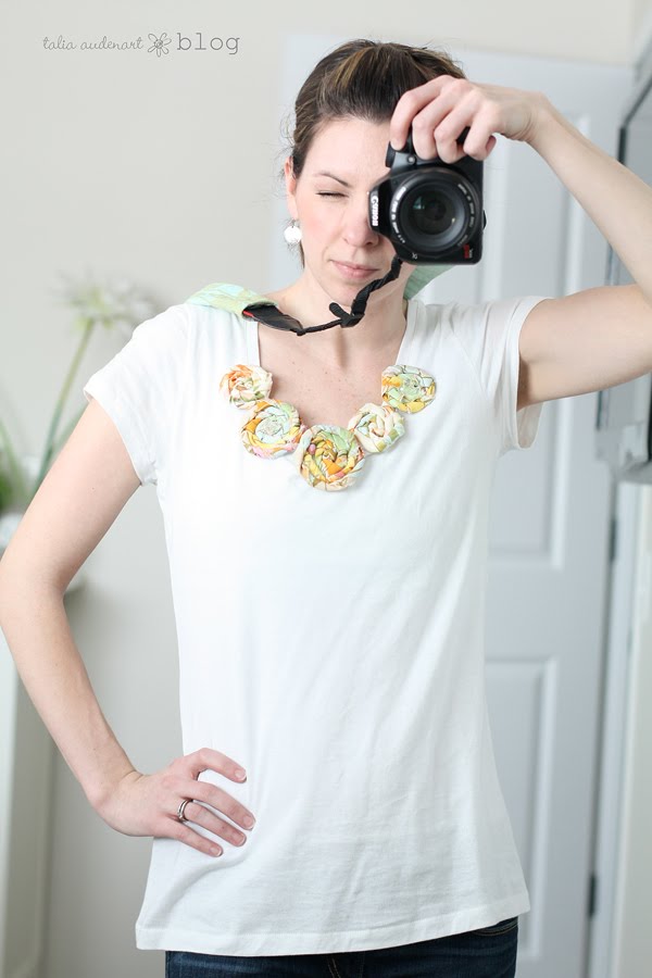 I was going to embellish some little t-shirts for my girls with these flowers, and who am I kidding, I will probably still do that, but I guess with necklaces you can wear them with anything. My fingertips are bruised from sewing these babies together, but it was so, so fun!